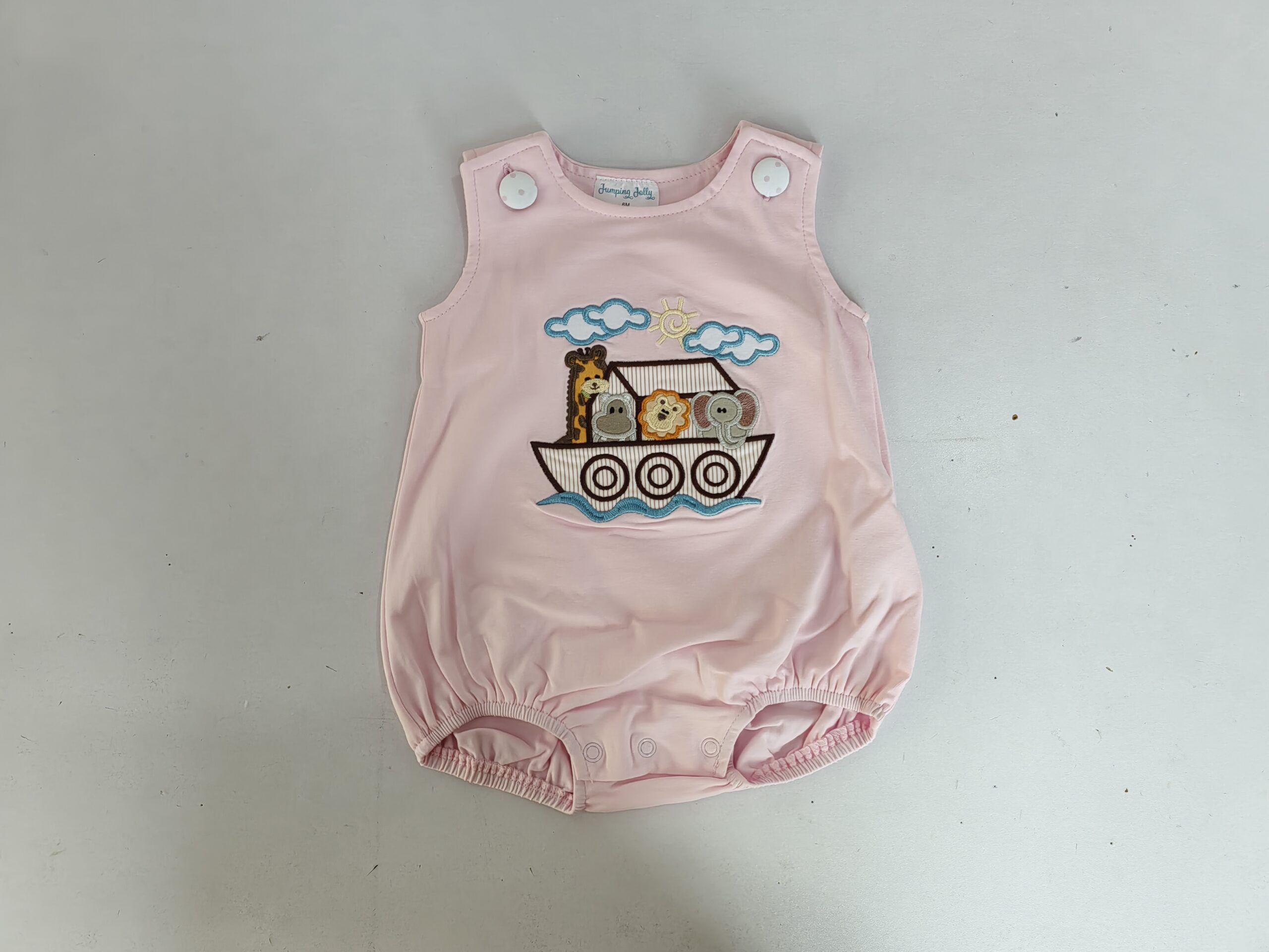 Adorable pink sleeveless romper featuring a cute Noah’s Ark animal applique (giraffe, lion, elephant) with sun and cloud details. Designed with white snap buttons at the shoulder straps for easy dressing and a ruffled elastic leg opening for comfort. Crafted from buttery-soft 95% cotton 5% spandex, perfect for summer days.