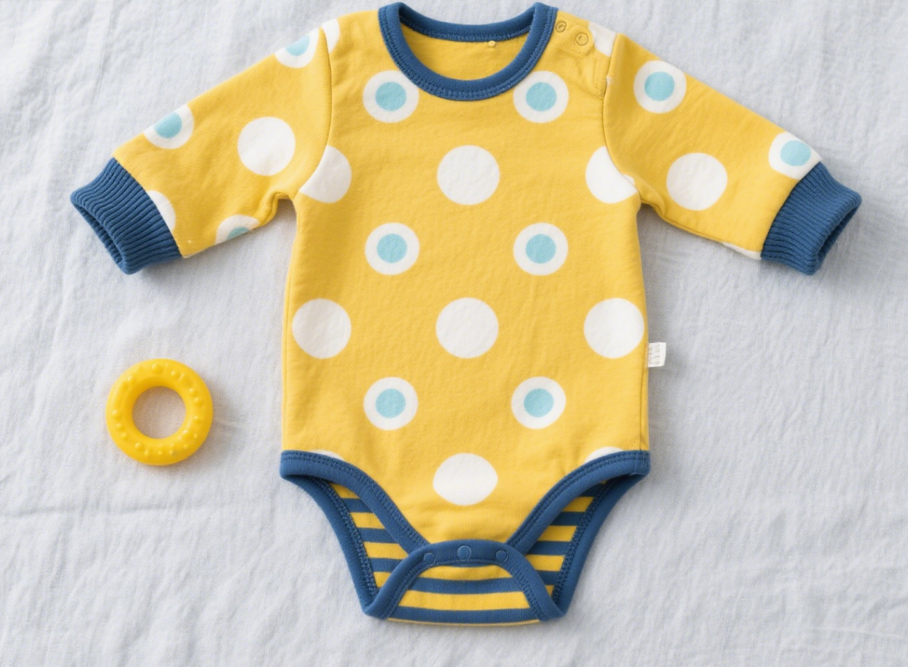 This infant onesie features a bright yellow base paired with white and light blue polka dot prints, and dark blue contrasting details on the neckline, cuffs and hems—simple yet lively. Made of soft, skin-friendly fabric, the snap closure allows easy dressing and care, and the long-sleeve style fits spring and autumn daily wear. It’s a comfortable choice for babies to create a fresh, minimalist look.