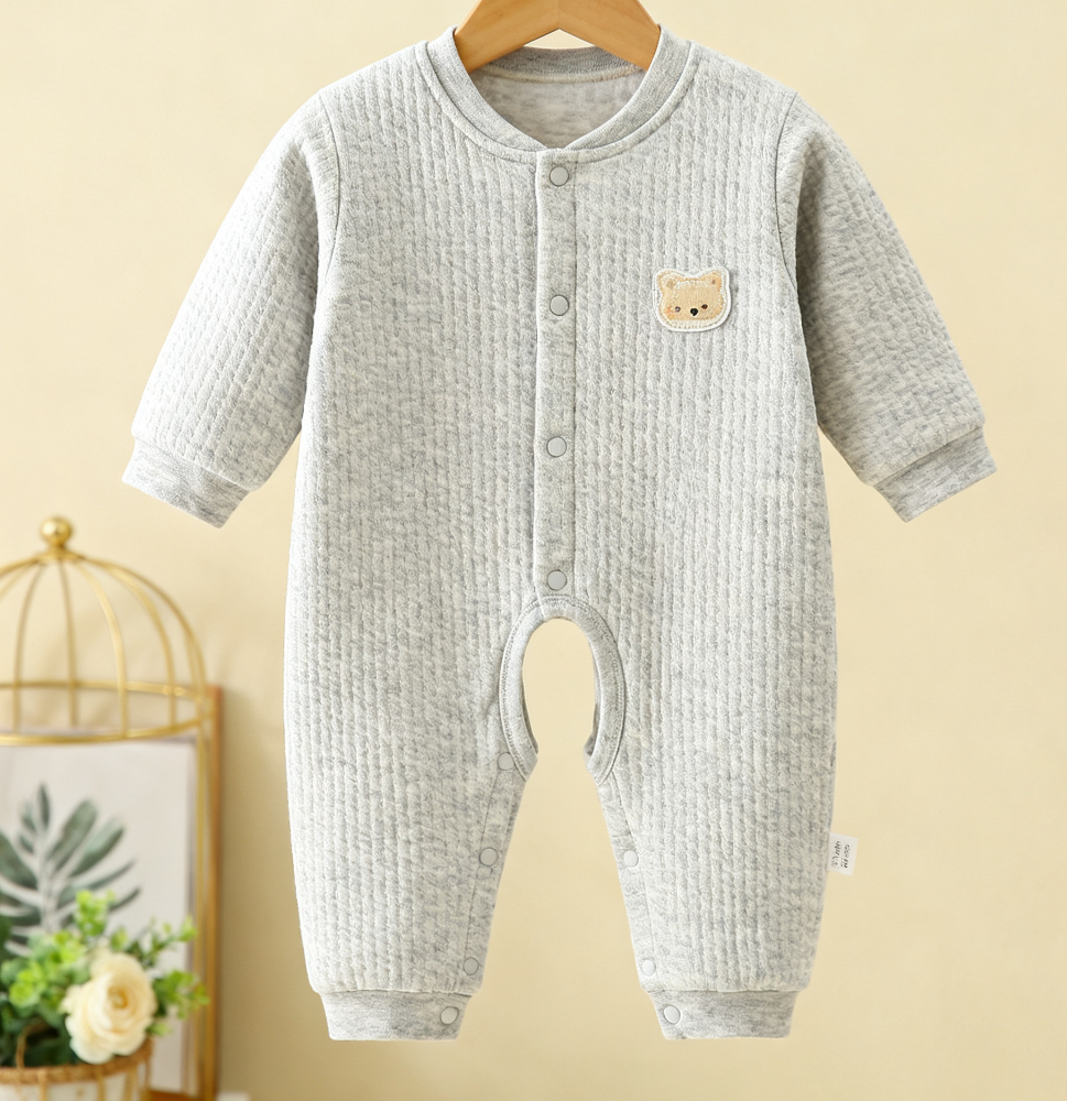 This infant onesie features a light gray hue, made of knitted textured fabric that’s soft, skin-friendly and warm. The front zipper design allows easy dressing and undressing, and the small chest patch adds a cute detail. The open-crotch style is convenient for daily care, and the long-sleeve design fits autumn and winter needs—it’s a practical choice for babies to create a comfortable, simple and cute look in daily wear.