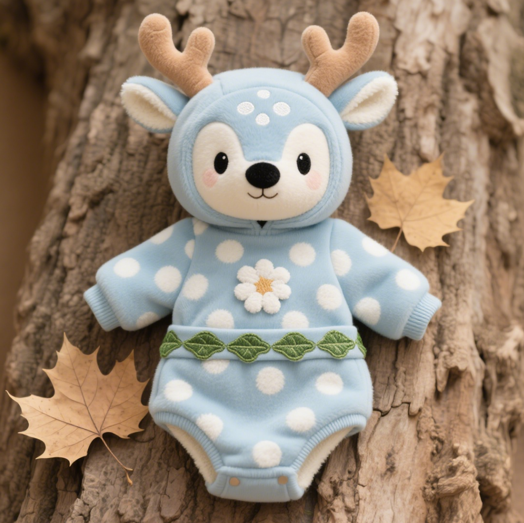 This infant hooded onesie takes a fawn as the cute theme, featuring a light blue base paired with white polka dots; the hood restores the fawn’s shape (with 3D antlers and round ears), and the body is decorated with flower and leaf details for a fresh, soft vibe. Made of soft fabric, it’s skin-friendly and comfortable; the hood balances cuteness and warmth, and the bottom snap buttons facilitate care. Suitable for spring and autumn daily wear, it’s an adorable choice for babies to create a healing animal-themed look.