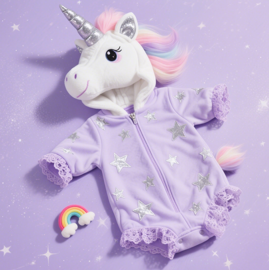 This infant onesie takes a unicorn as the fairy-tale theme, featuring a light purple base paired with silver star prints; the hood restores the unicorn shape (with gradient colorful hair and shiny silver horn), and the lace trim on cuffs and hems adds delicacy. Made of soft fabric, it’s skin-friendly and comfortable; the zipper closure allows easy dressing. Suitable for spring and autumn daily wear, it’s an adorable choice for babies to create a fairy-tale fantasy-themed look.