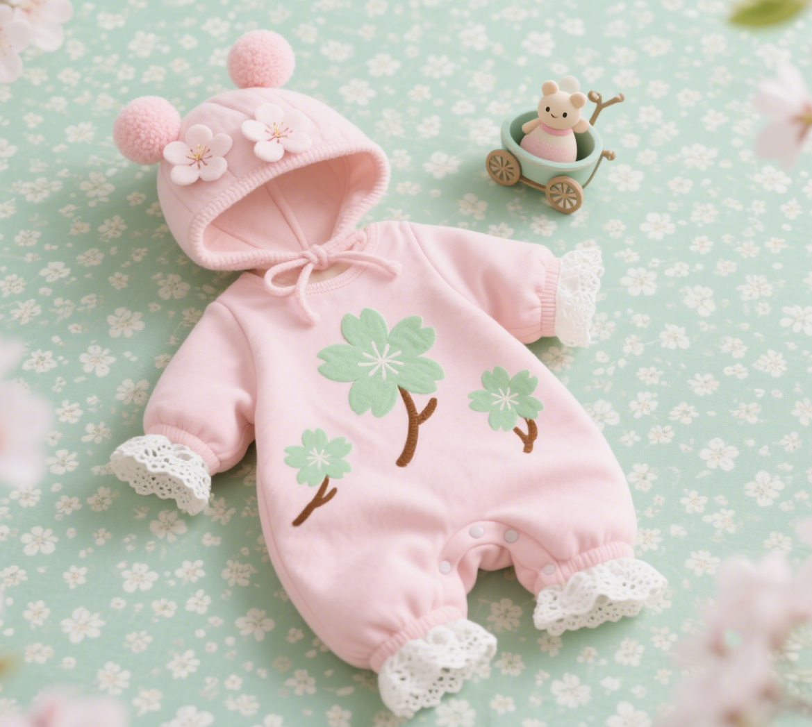 This infant onesie takes cherry blossoms as the design element, featuring a soft pink base paired with light green cherry blossom prints; the hood’s 3D pom-poms and flower details add cute sweetness. Made of soft fabric, it’s skin-friendly and comfortable; the lace trim on cuffs and hems enhances delicacy, the tied hood fits different head sizes, and the snap closure allows easy dressing. Suitable for spring and autumn daily wear, it’s an adorable choice for babies to create a fresh spring-themed look.