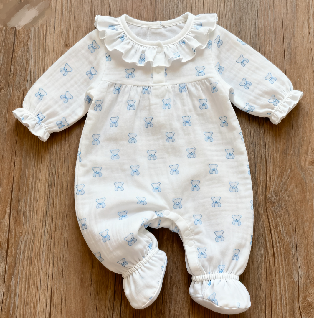 This infant onesie features a white base with all-over blue teddy bear prints, cute and charming. It has a ruffled collar for a sweet touch, and a long-sleeve footed design. Made of soft and skin-friendly fabric, it ensures comfort for babies, making it an ideal choice for daily home wear or outings, fully showcasing the baby’s innocence and cuteness.