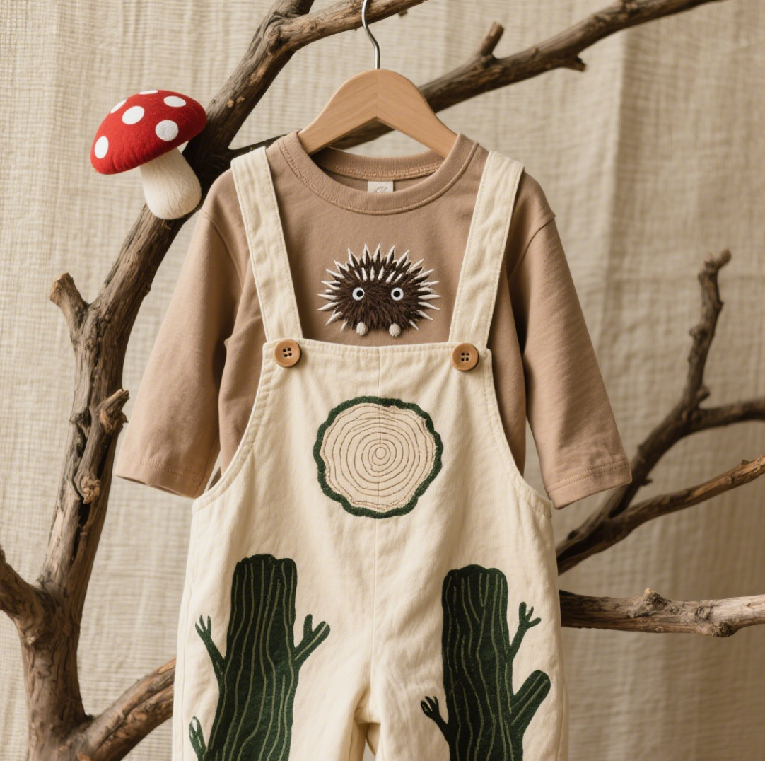 This infant outfit includes a khaki long-sleeve T-shirt and forest-themed overalls. The T-shirt is decorated with a 3D hedgehog detail, while the overalls feature an off-white base paired with tree stump and tree embroidery elements to restore the forest vibe. Made of soft, comfortable fabric, the adjustable suspenders and button closure allow easy dressing. With a natural, healing style, it’s suitable for spring and autumn daily wear—it’s a comfortable choice for babies to create a fresh forest-themed look.