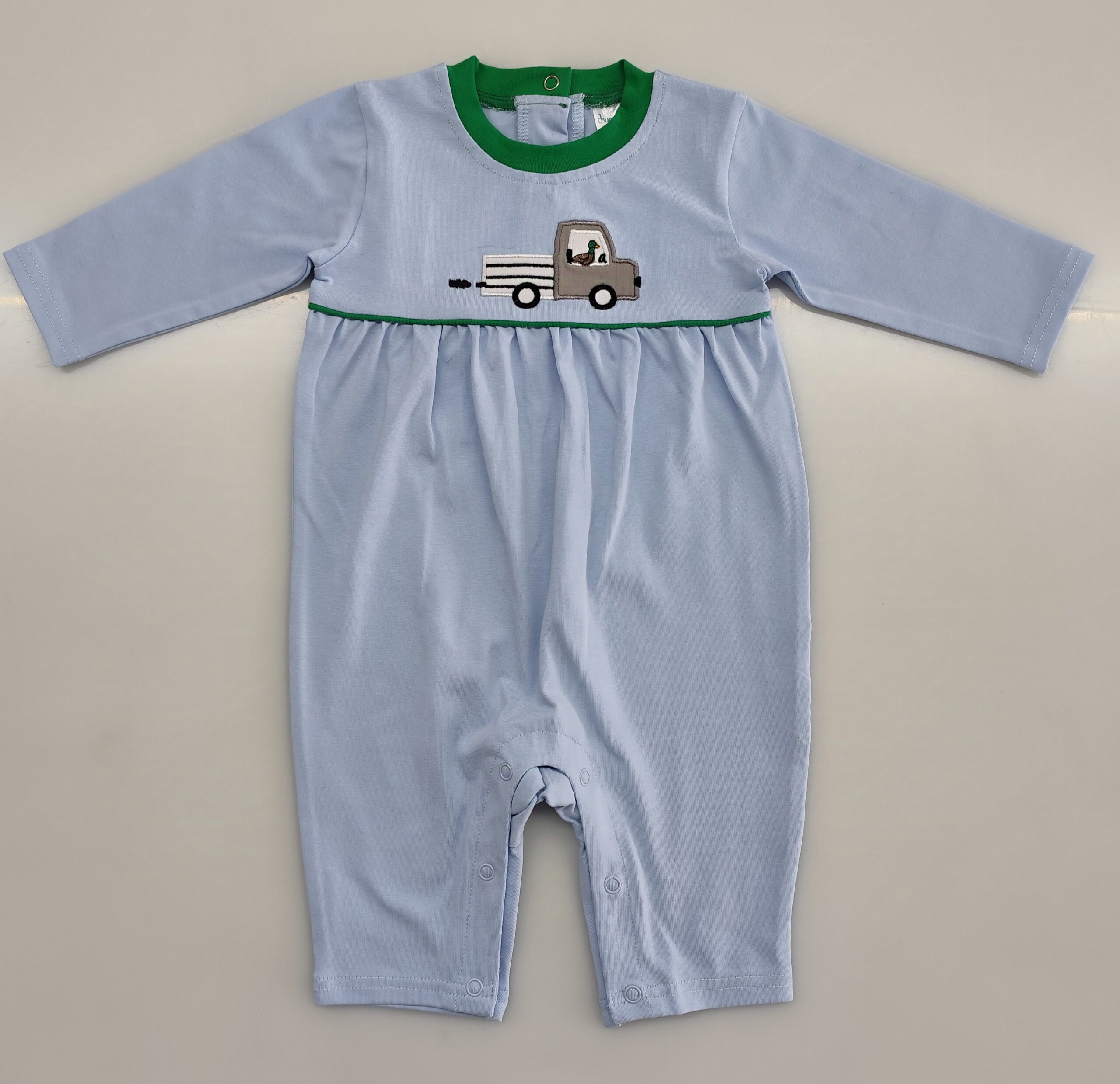 This is a light blue long-sleeved romper for infants and toddlers. It features a green contrast-trimmed neckline, an embroidered cartoon truck pattern on the front, and a gathered line in the middle for added texture. Snap buttons at the leg openings enable easy dressing, and the fresh, playful style makes it ideal for babies’ daily wear.