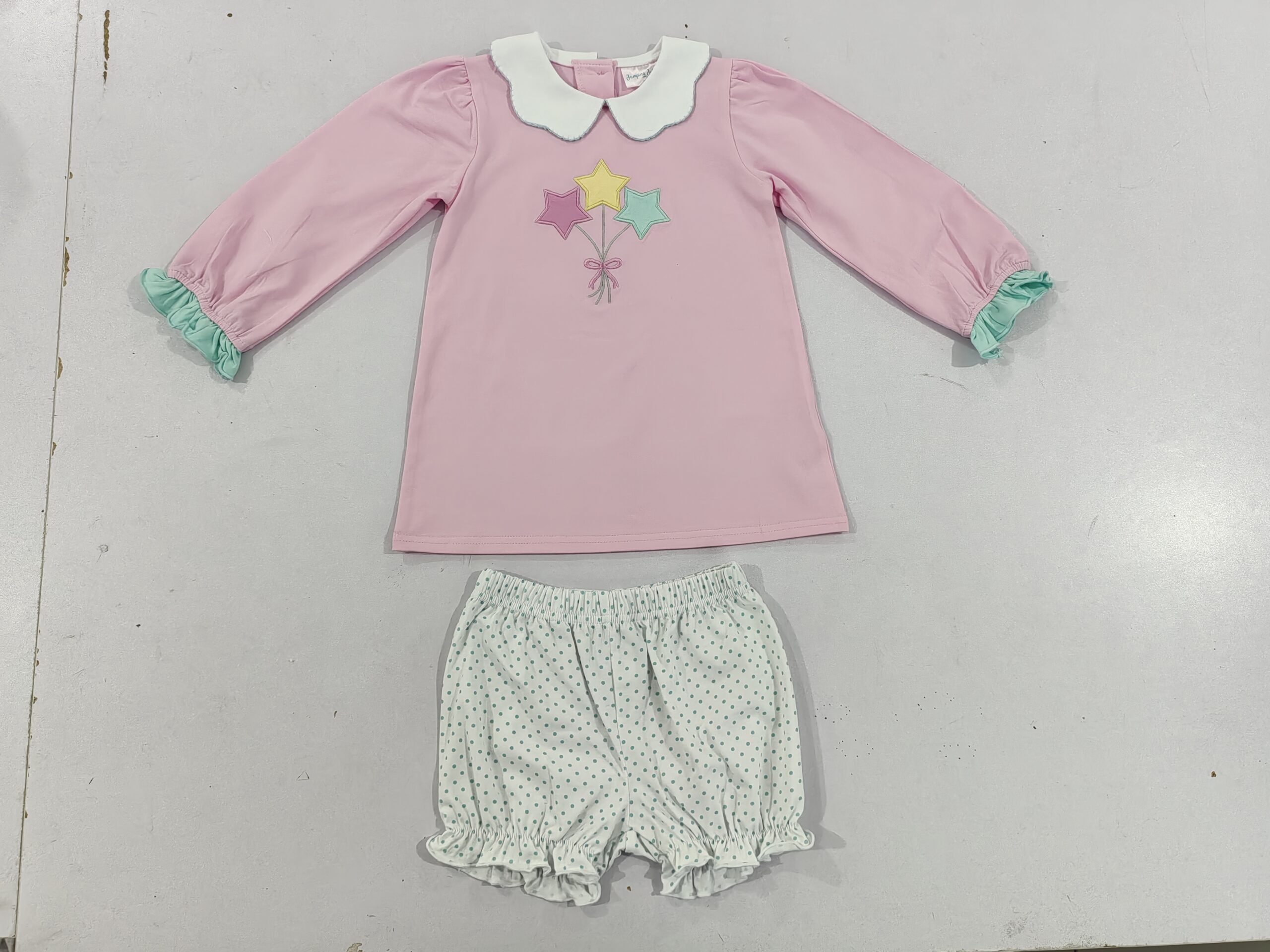 Adorable Peter Pan collar design with cute balloon embroidery. Matched with polka dot bloomer shorts. Premium soft cotton, sweat-wicking, lightweight for indoor and outdoor wear.