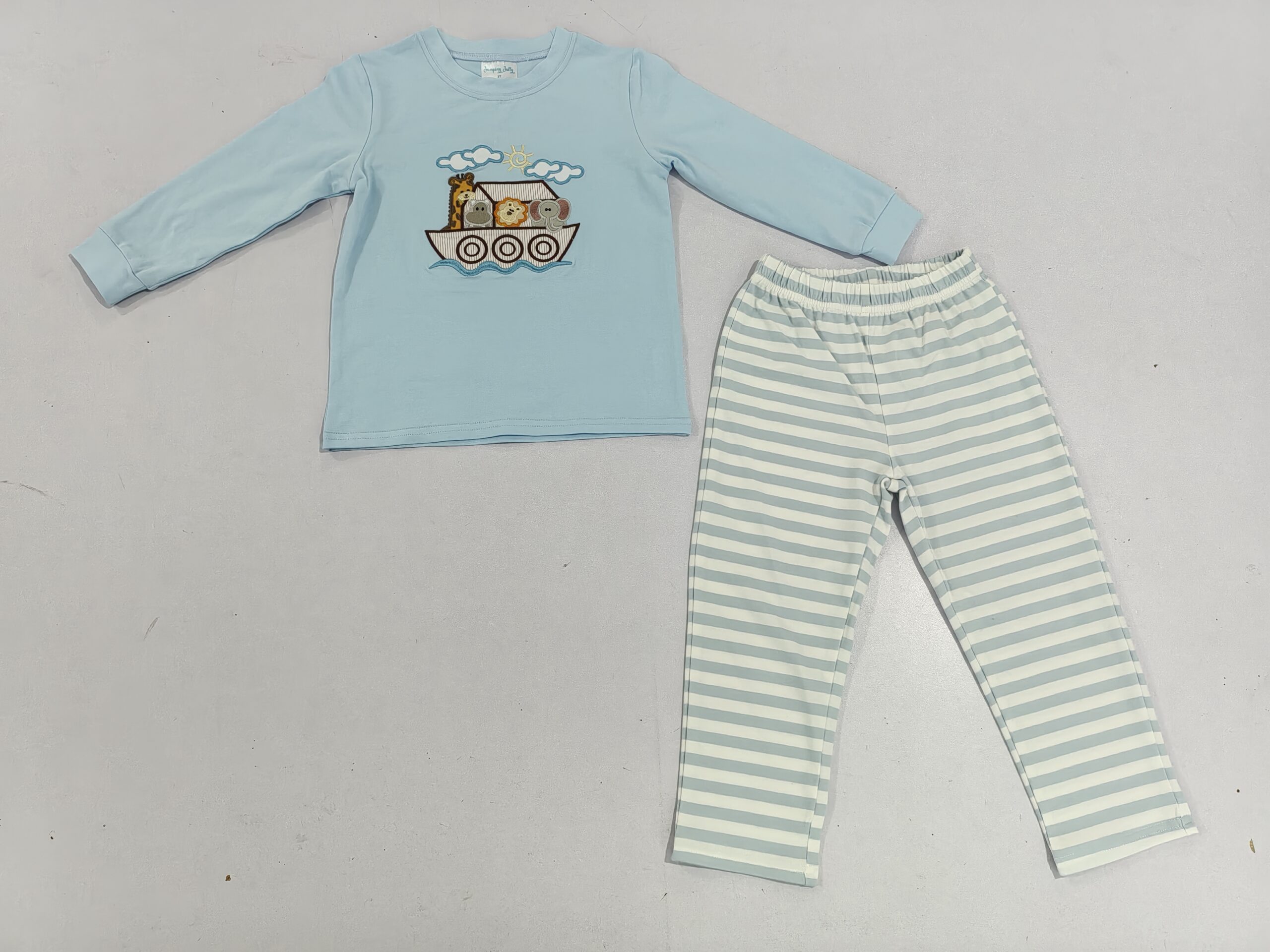 Simple crew neck top with vivid Noah’s ark animal embroidery. Cooperated with striped trousers. Breathable soft fabric, fine workmanship, suitable for little boys daily wear.