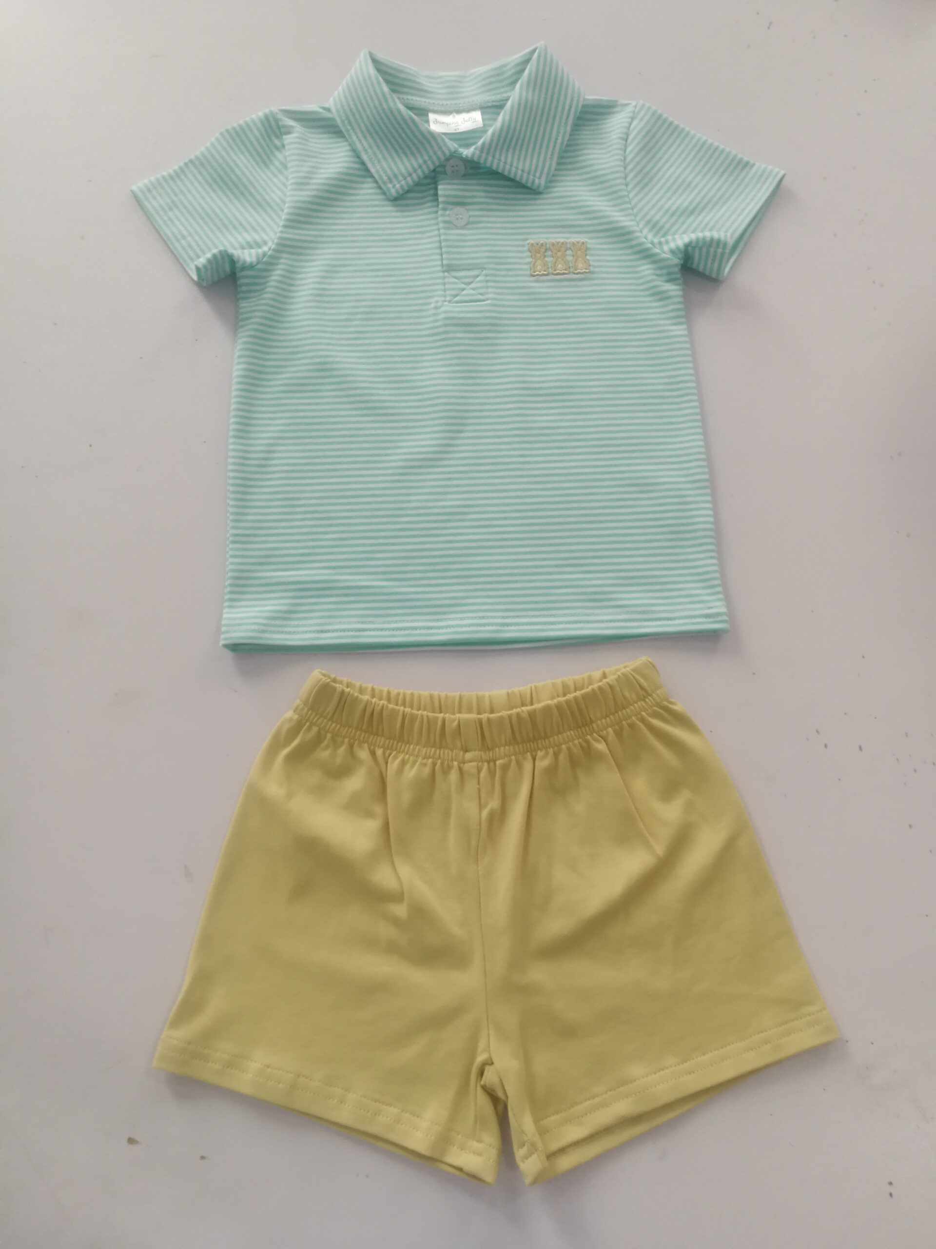 This adorable two-piece set features a soft mint-green striped polo shirt with delicate embroidered details, paired with solid yellow shorts. Made from premium, breathable cotton fabric, it’s gentle on baby’s sensitive skin, lightweight and comfortable for all-day play, naps, and summer outings. The classic polo style and cheerful color combination make it perfect for everyday wear, family photos, and casual occasions. Durable stitching and an elastic waistband on the shorts ensure a secure, easy fit for little ones.