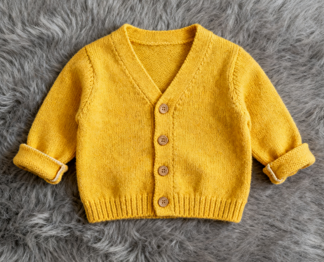 This infant cardigan features a bright yellow hue, made of soft knitted fabric that’s skin-friendly and comfortable. The V-neck and button design allow easy dressing, while the cuffed sleeves add casual details. With a simple and fresh style, it’s suitable for layering or wearing alone in spring and autumn—it’s a practical choice for babies to create a lively and gentle look.