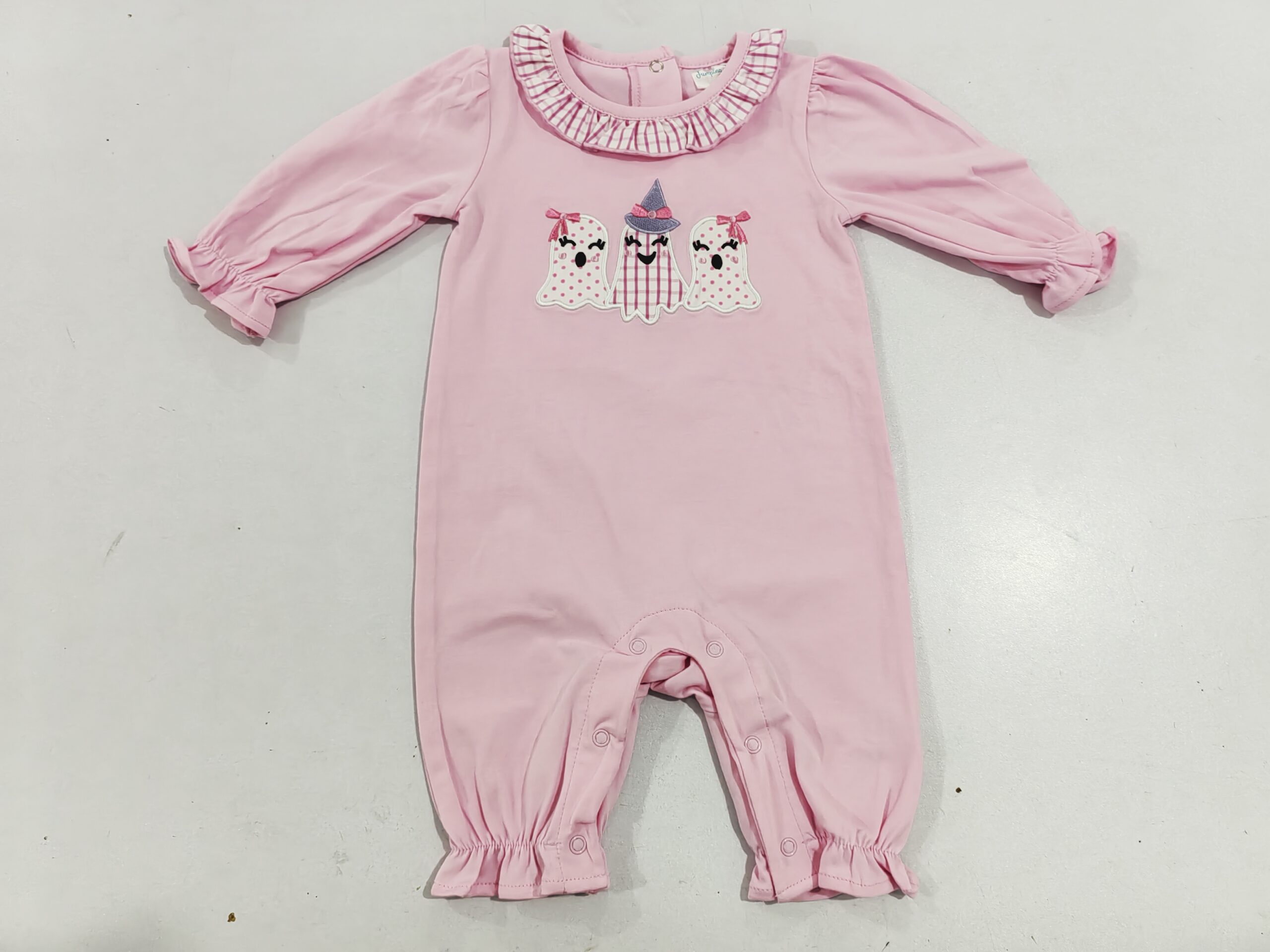 This sweet Halloween romper features a solid pink base with three cute ghost appliques on the chest. It has a pink and white checkered ruffled collar, long sleeves with ruffled elastic cuffs, and ruffled leg openings. Made of soft fabric, it’s perfect for Halloween and everyday wear.