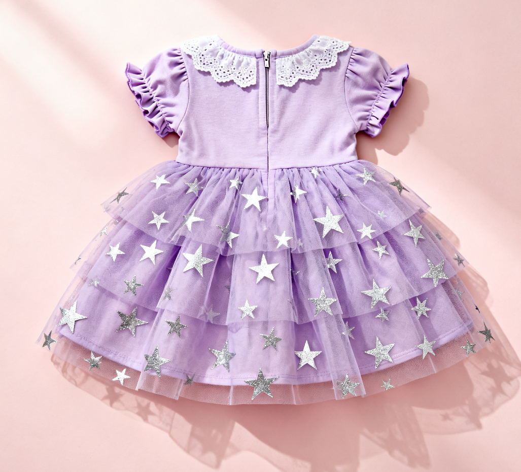 This girls’ dress features a dreamy light purple hue. The lace-trimmed neckline and short puff sleeves are full of sweet charm, while the multi-layered tulle skirt printed with star patterns is light and lively. Made of soft, skin-friendly fabric, it’s suitable for spring and summer outings or small parties—an adorable choice for your baby to transform into a sweet star-themed little princess.