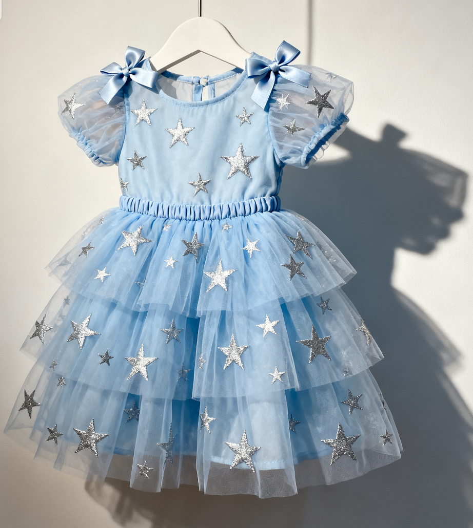 This girls’ starry sky-themed formal dress features a fresh light blue tone, covered with silver glittering star patterns, as if wearing a bright galaxy. The short-sleeved tulle sleeves are adorned with satin bows, lively and delicate. The multi-layered tulle skirt is fluffy and dreamy, and the waist design accentuates the figure. With an overall dreamy and eye-catching style, it is an excellent choice for your baby’s birthday parties and fairy-tale themed events, helping your little one transform into a little princess under the stars.