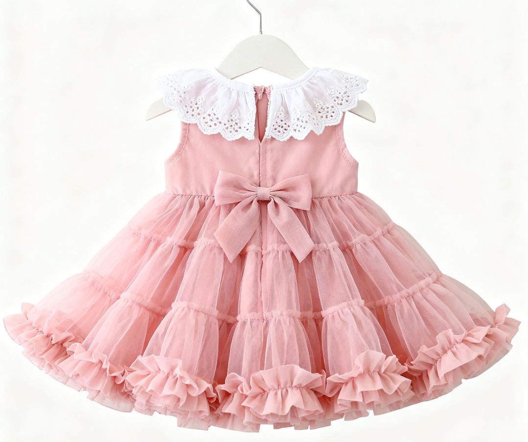 This pink princess dress for girls features a soft pink color, with an elegant white lace collar and a large bow at the waist that adds a sweet touch. The multi-layered tulle skirt is fluffy and dreamy, and the sleeveless design is suitable for spring and summer. With a romantic and eye-catching style overall, it is an excellent choice for your baby’s birthday parties and fairy-tale events, helping your little one transform into a dreamy little princess.