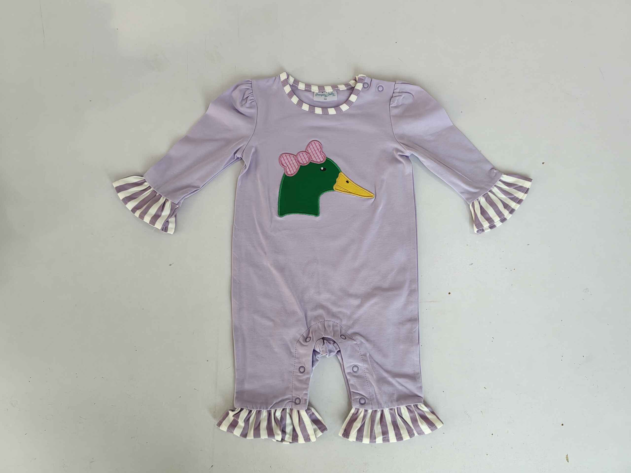 This soft lavender romper features a cute mallard duck applique with a pink bow on the chest. It has striped ruffle cuffs on both sleeves and legs, a striped crew neck, and snap closures at the crotch for easy diaper changes. Perfect for everyday wear and photo shoots.