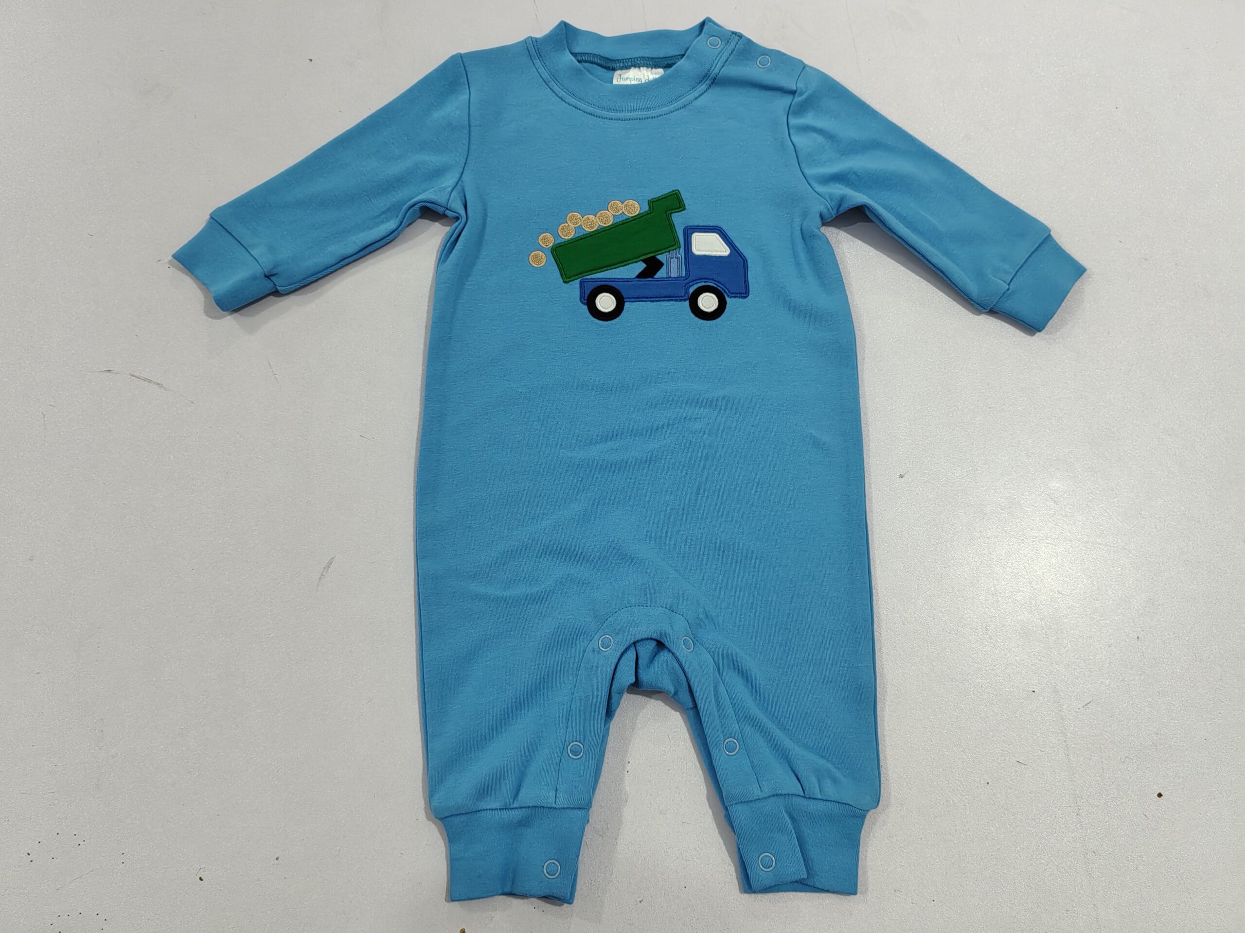 This fun romper features a solid blue base with a dump truck applique on the chest. It has matching blue ribbed trim on the crew neck and cuffs, plus snap closures at the crotch. Made of soft fabric, it’s perfect for little truck lovers.