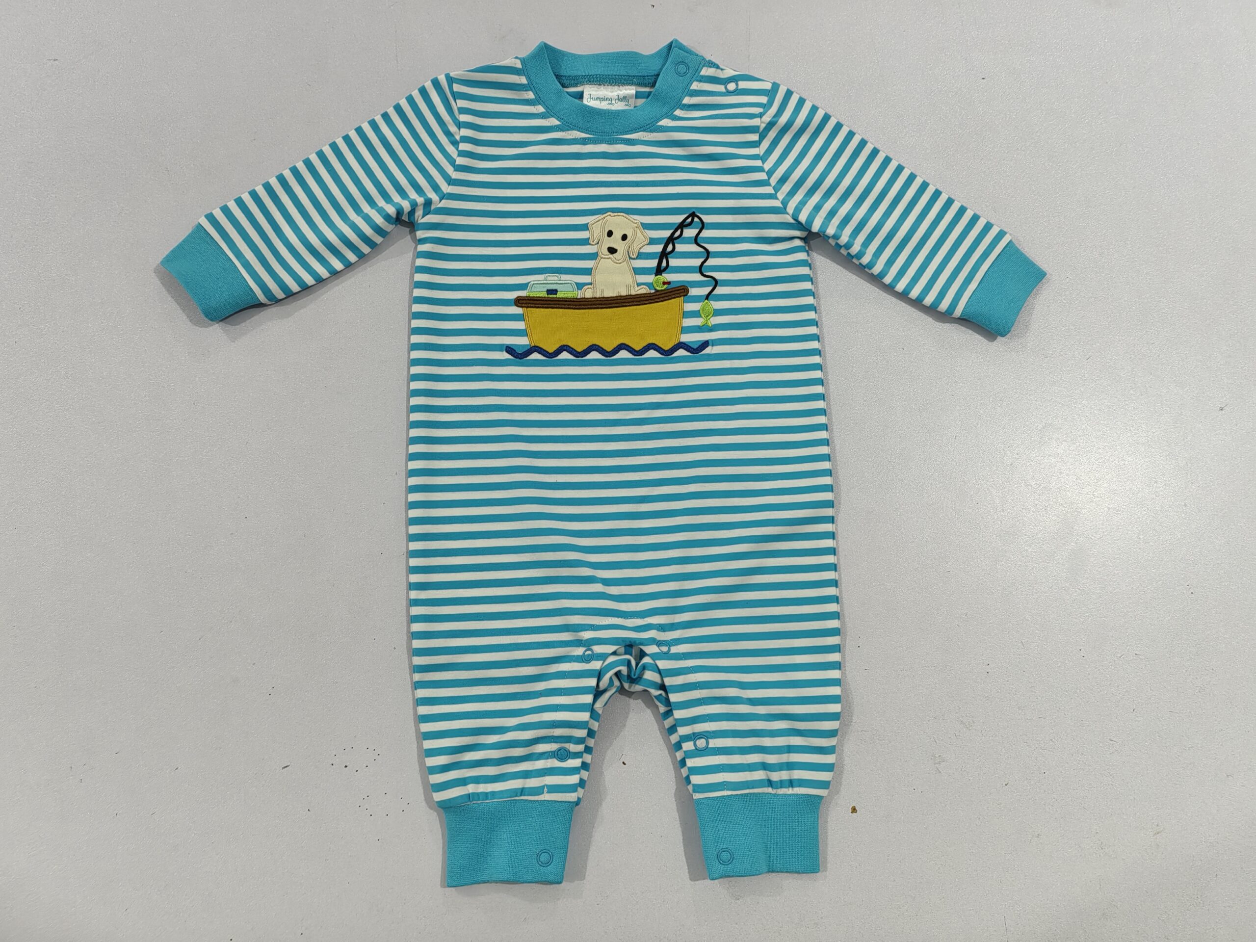 This charming romper features teal and white stripes with a cute dog in a fishing boat applique on the chest. It has solid teal ribbed trim on the crew neck and cuffs, plus snap closures at the crotch. Ideal for everyday wear.