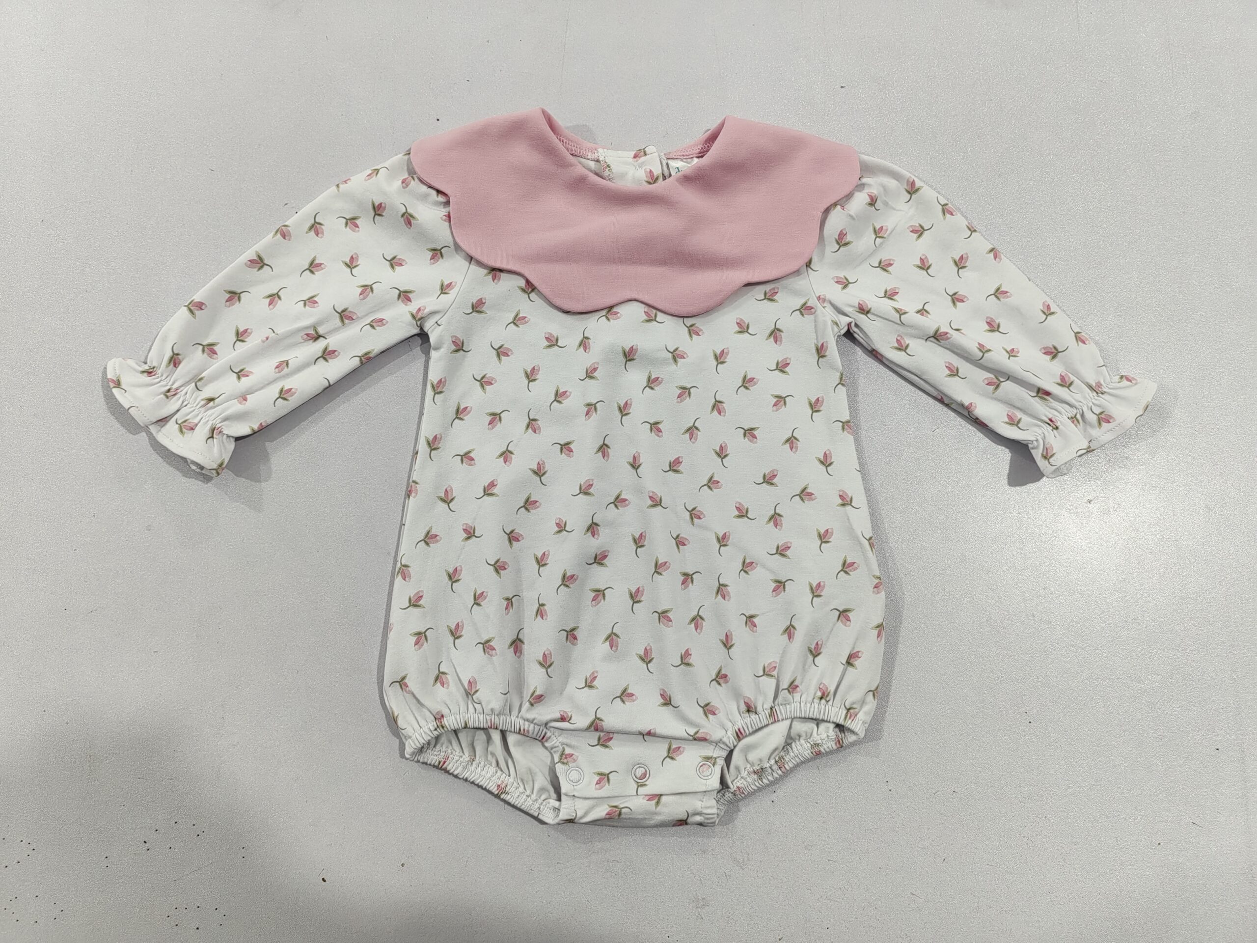 This delicate romper features a soft pink floral bud print on a white base, with a sweet pink scalloped collar. The long sleeves have ruffled elastic cuffs, adding a feminine touch. Made of soft, stretchy fabric, it’s perfect for everyday wear and special occasions.