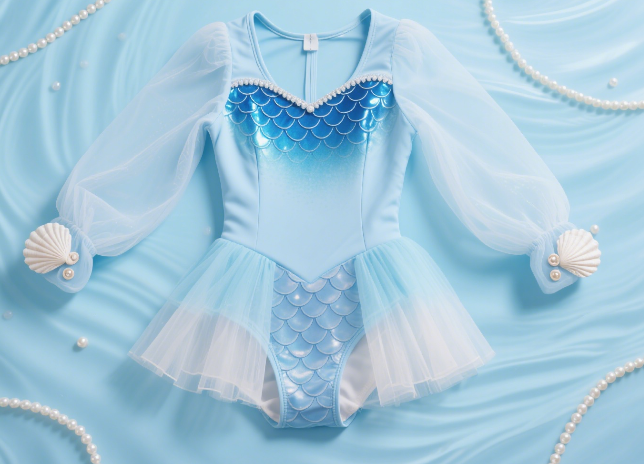 This girls’ mermaid-shaped onesie features a gradient light blue hue, with sequined fish-scale details on the chest that restore the mermaid texture; the long-sleeve tulle and shell cuffs are full of dreamy charm, and the multi-layered tulle skirt creates a fluffy effect. Made of lightweight, skin-friendly fabric, it’s suitable for parties, performances and other occasions—it’s an adorable choice for your baby to transform into a fairy-tale mermaid.