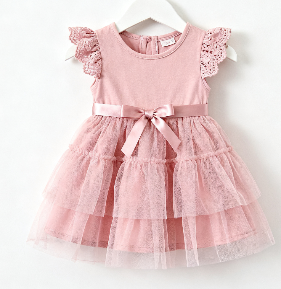 This girls’ dress features a soft pink hue, with lace details on the flutter sleeves and a waist bow that’s brimming with sweet charm. The top part is made of soft knitted fabric, while the skirt is designed with multi-layered glitter tulle for a fluffy, lively and shiny look. The sleeveless style suits spring and summer—it’s an adorable choice for your baby to create a sweet and sparkling look.