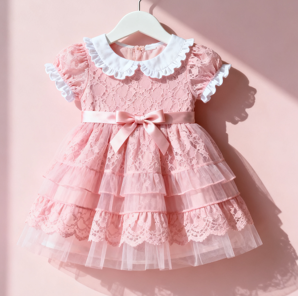 This girls’ dress features a soft pink hue. The white lace Peter Pan collar and flutter sleeves are full of sweet charm; the dress combines lace and tulle, with a multi-layered skirt that’s fluffy and delicate, and a waist bow adds elegance. Made of lightweight, skin-friendly fabric, it’s suitable for parties, outings and more—it’s an exquisite choice for your baby to transform into a sweet little princess.