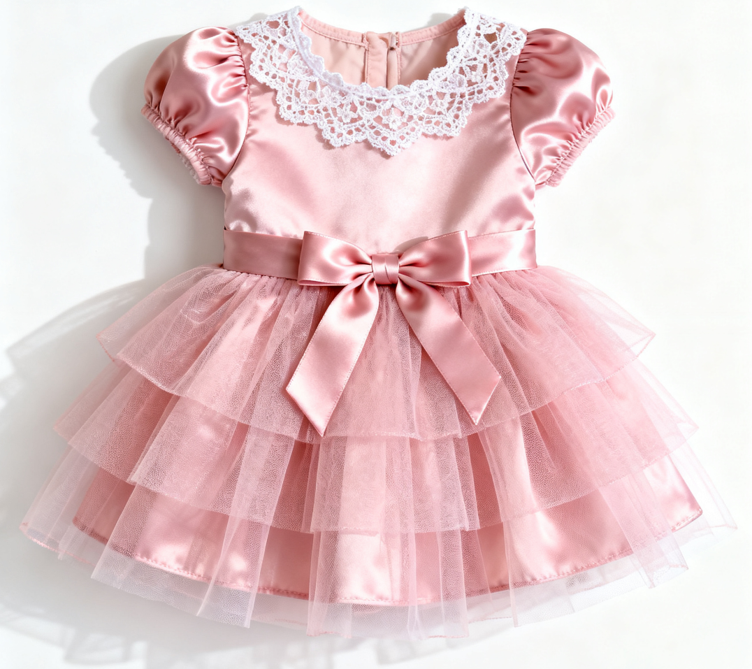 This girls’ dress features a soft pink hue. The white lace trim at the neckline and puff sleeves are full of sweet charm; the dress combines satin and multi-layered tulle, with a delicate and fluffy silhouette, and a large waist bow adds elegance. Made of lightweight, skin-friendly fabric, it’s suitable for parties, banquets and other formal occasions—it’s an exquisite choice for your baby to transform into a sweet little princess.