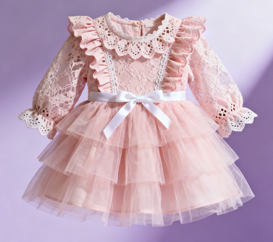 This long-sleeve dress for girls features a soft pink hue, with delicate lace panels on the neckline and long sleeves. The layered tulle skirt is fluffy and dreamy, and the white bow at the waist adds extra sweetness. Made of soft, skin-friendly fabric, the long-sleeve design balances warmth and style—it’s a perfect princess-style choice for babies’ daily wear or small birthday gatherings, easily creating a soft, cute and sweet look.