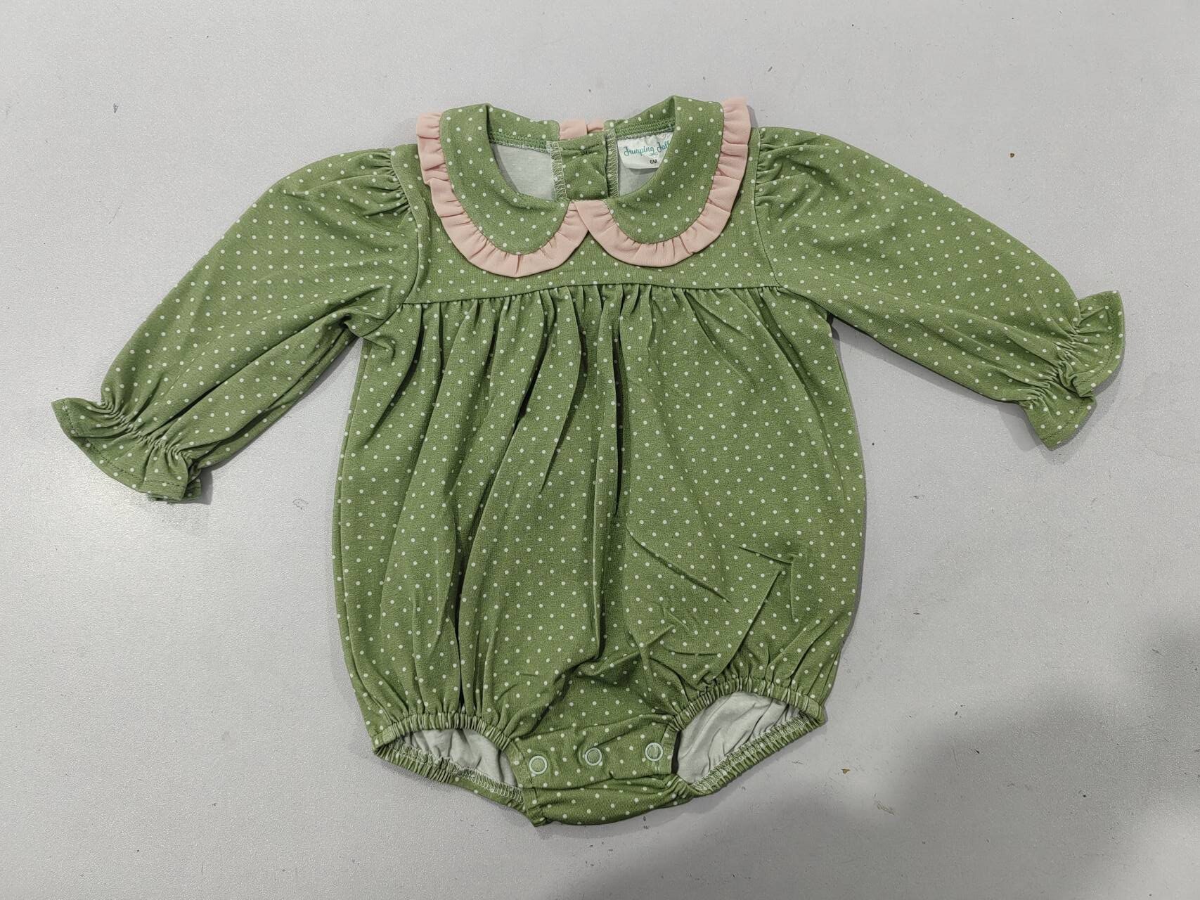 This adorable romper features a green and white polka dot print, with a sweet pink ruffled Peter Pan collar. The long sleeves have elastic ruffle cuffs, adding a playful touch. Made of soft, stretchy fabric, it’s perfect for everyday wear and casual outings.
