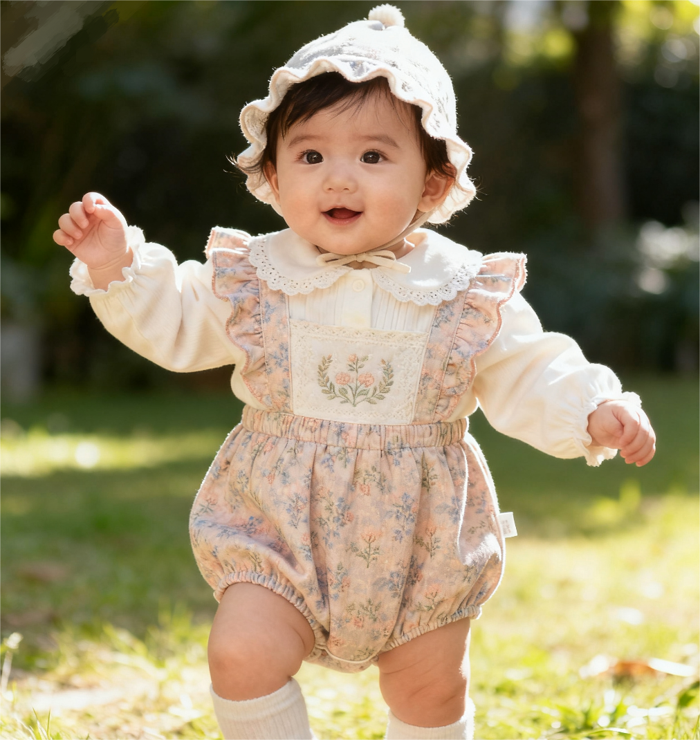 This infant outfit includes a floral suspender onesie, a white inner top, and a ruffled hat, featuring fresh floral patterns for a gentle and elegant vibe. The ruffle details on the suspenders and chest embroidery add sweet charm, and the fabric is soft and skin-friendly. Suitable for spring and summer outdoor wear, it’s an exquisite choice for babies to create a fresh, soft and cute look.