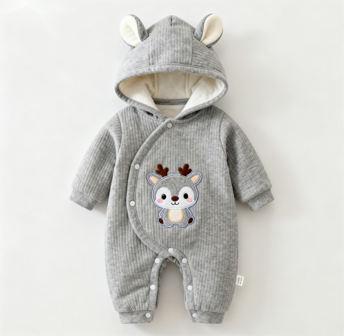 This infant onesie is mainly in gray, featuring a hooded design with three-dimensional animal ears on the hood. It has a cute animal pattern on the body, exuding a lovely and playful style. Made of warm fabric, it has side snap buttons for easy dressing and undressing. It’s a warm choice for babies to create a cute look in autumn and winter.