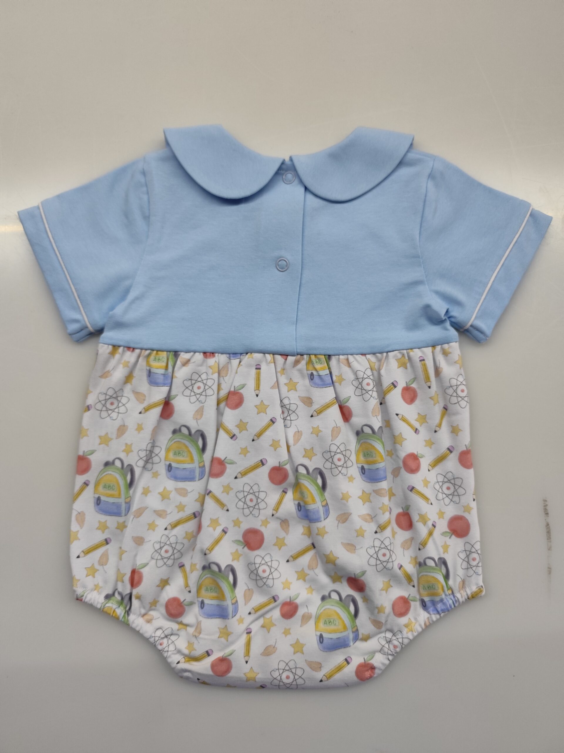 This is a short-sleeved collared romper for infants and toddlers, featuring a two-piece panel design: The upper part is light blue with a lapel and white piped cuffs; the lower part has a white base printed with school-themed patterns like backpacks, apples, and pencils. The lively, fresh style is cute and playful, ideal for babies’ daily wear or school-related occasions.