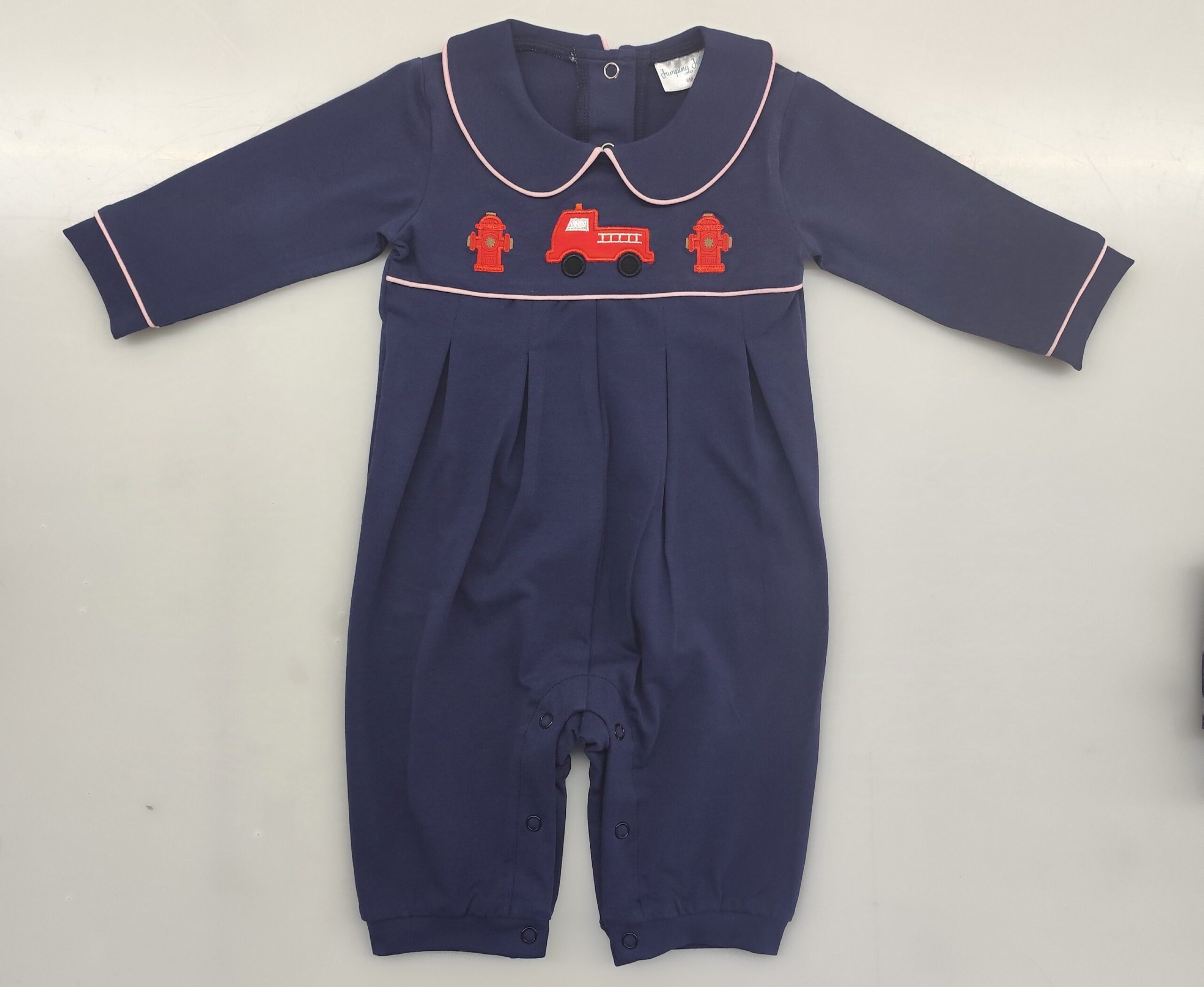 This is a navy blue long-sleeved romper for infants and toddlers. It features a contrast-trimmed lapel neckline, with red embroidered patterns of a fire truck and fire hydrants on the front. Snap buttons at the leg openings ensure easy dressing, and the overall style is delicate yet playful, suitable for babies’ daily wear or festive occasions.