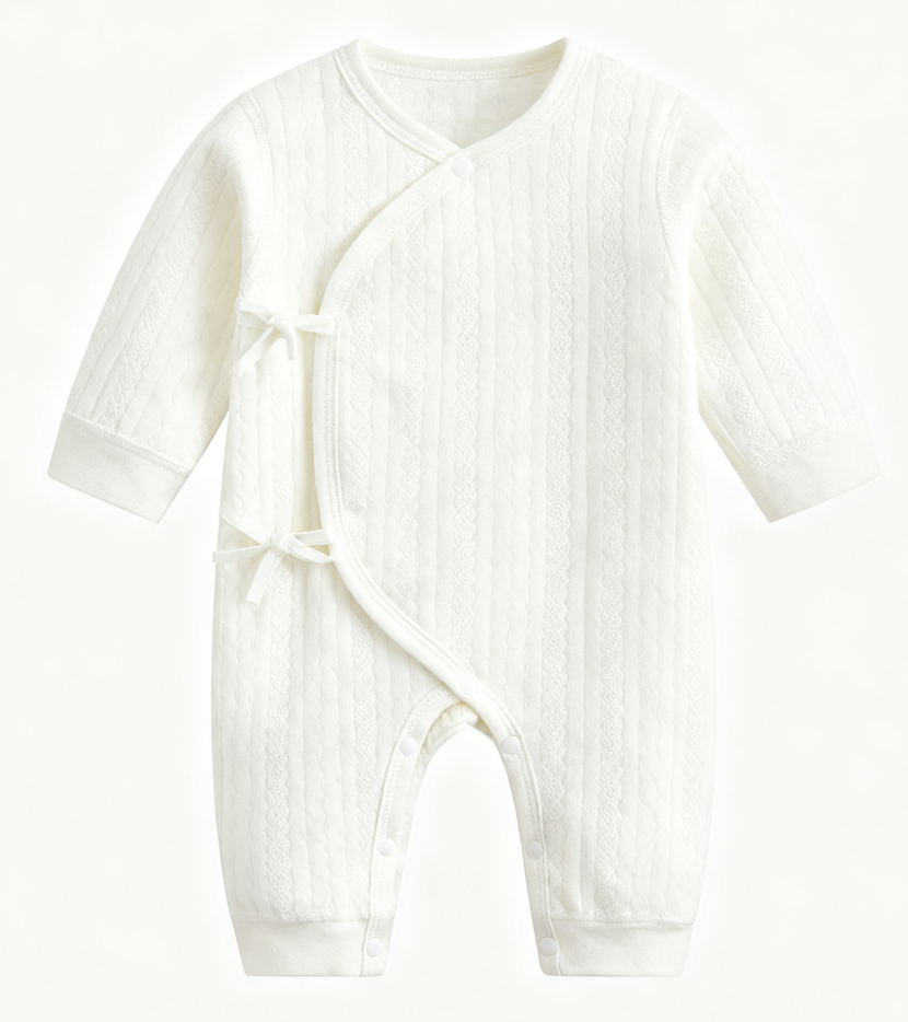 This newborn onesie features a pure white hue, made of ribbed knitted fabric that’s soft, skin-friendly and breathable. The wrap-front tie design is suitable for newborn dressing, and the open-crotch style facilitates daily care. With a simple and gentle style, it’s a considerate choice for newborns to create a comfortable, skin-friendly look.