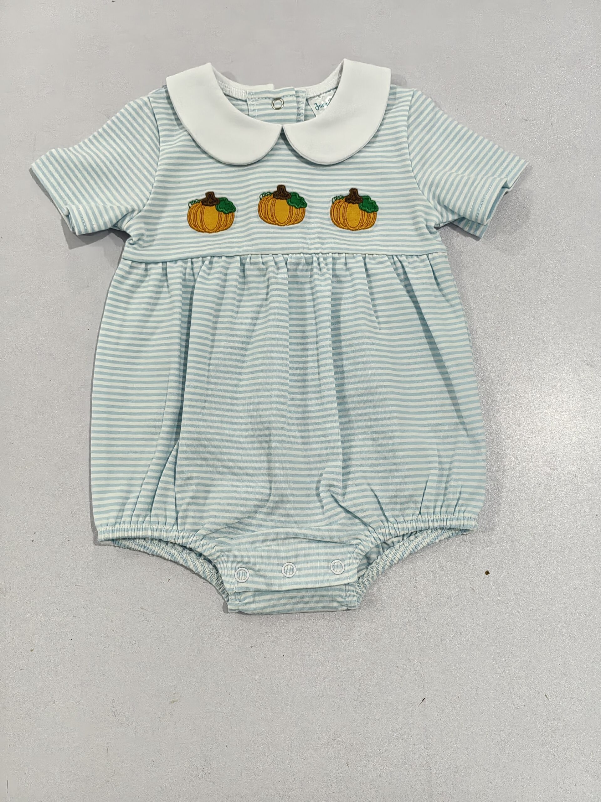 Classic light blue and white striped romper with a crisp white Peter Pan collar and three charming pumpkin appliques on the chest. The empire waist design creates a flowy bubble silhouette. Made of high-quality 95% cotton 5% spandex, offering gentle stretch and breathability for your little one’s all-day comfort.