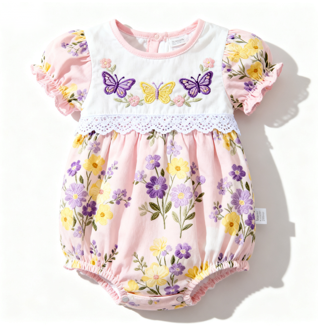 ### 产品描述简介(中文) 这款婴幼儿短袖哈衣,以柔粉为底色,满印黄紫花卉图案清新烂漫。胸前白色区域绣有三只彩色蝴蝶,搭配白色蕾丝花边,泡泡袖边缘褶皱设计增添甜美感。整体风格充满春日花园气息,裆部按扣设计穿脱方便,是宝宝春夏季节打造清新萌系造型的优选。 ### 英文翻译 This infant short-sleeve onesie features a soft pink base with a烂漫 print of yellow and purple flowers, fresh and charming. Three colorful butterflies are embroidered on the white area at the chest, paired with white lace trim. The ruffled edges of the puff sleeves add a touch of sweetness. With an overall style full of spring garden vibes and a snap-button design at the crotch for easy dressing, it is an ideal choice for babies to create a fresh and cute look in spring and summer.