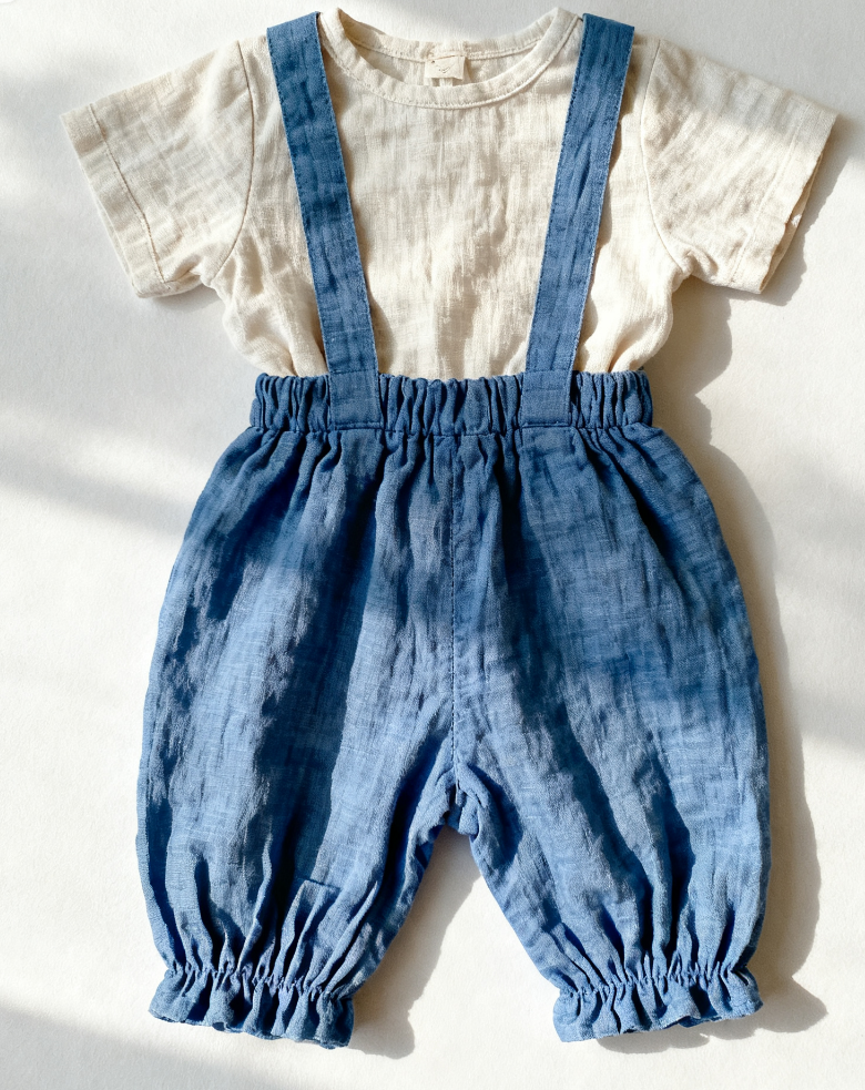 This infant outfit includes a beige textured short-sleeve T-shirt and light blue overalls. The overalls feature a loose silhouette with cuffed hems for a cute touch. Made of skin-friendly and breathable fabric, it’s suitable for spring and summer daily wear— a comfortable choice for your baby to create a fresh, casual and cute look.