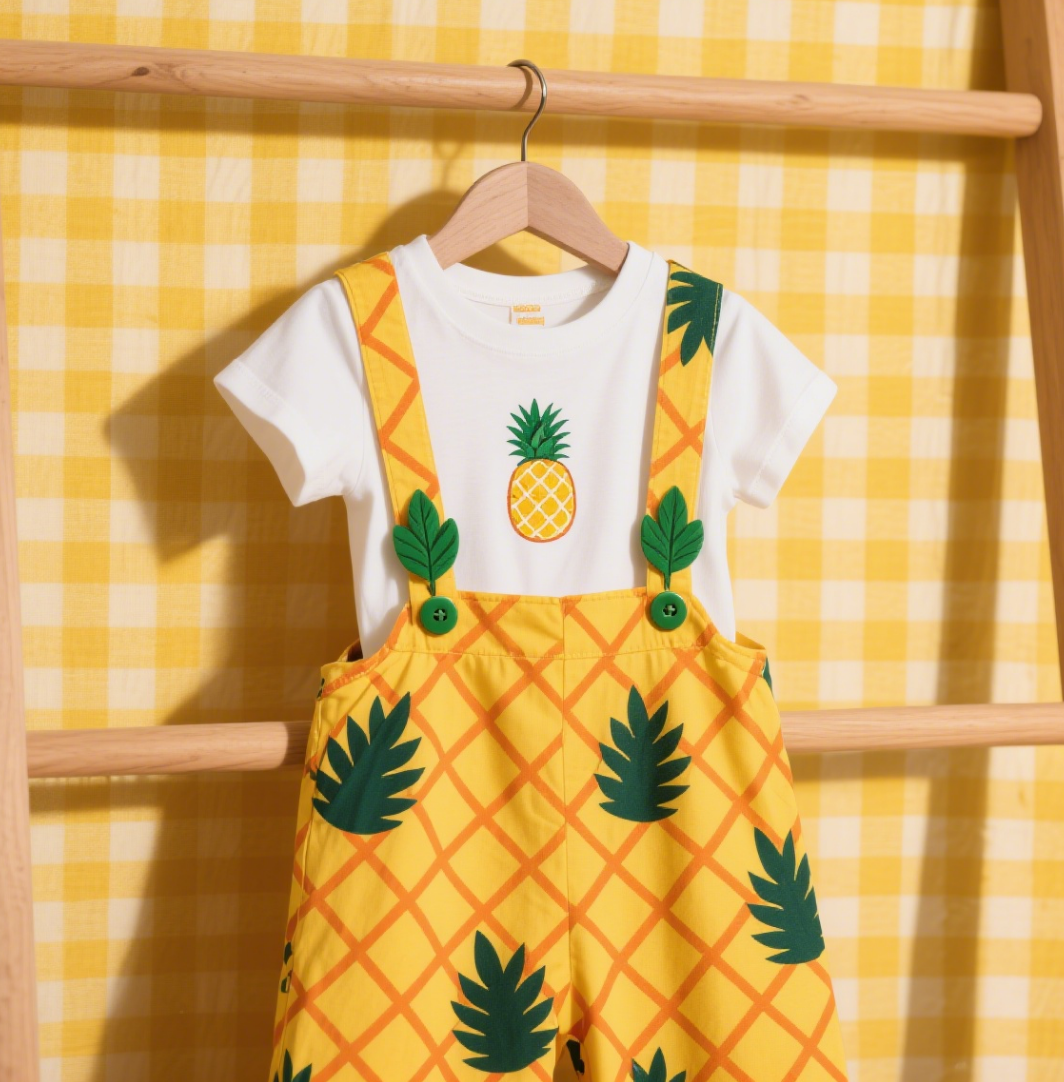 This infant outfit includes a white short-sleeve T-shirt and pineapple-themed overalls. The overalls feature a yellow-orange argyle base, paired with pineapple prints and 3D green leaf details for a fresh, lively vibe. Made of soft, breathable fabric, the adjustable suspenders fit the baby’s figure well. With a bright, playful style, it’s suitable for spring and summer daily wear—it’s a comfortable choice for babies to create a vibrant fruit-themed look.