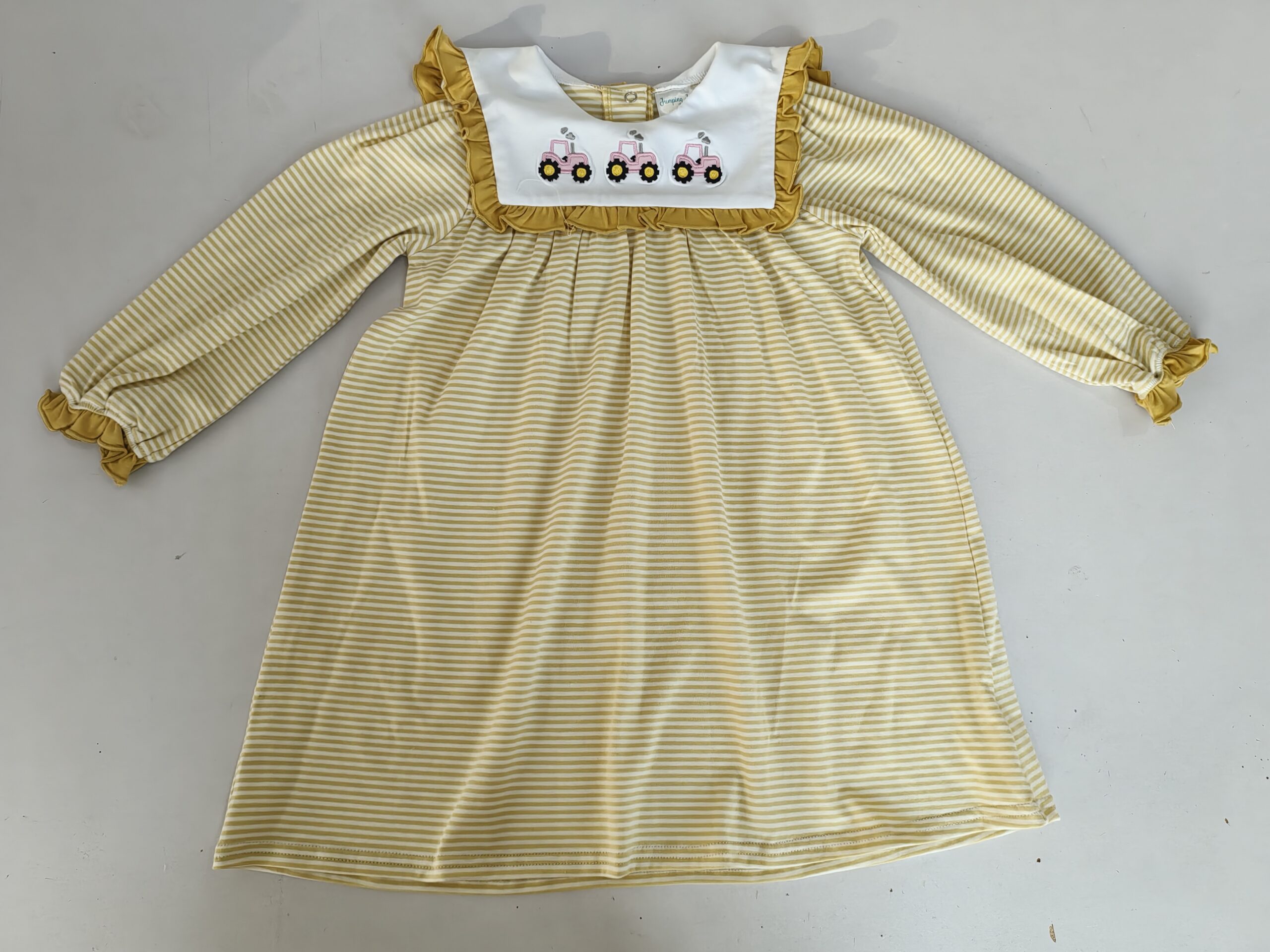 This infant dress takes cute little cars as the theme, featuring a light yellow fine-striped base. The neckline adopts a white-and-yellow ruffled design paired with pink car embroidery—sweet and lively. Made of soft, skin-friendly fabric, the long-sleeve style fits spring and autumn daily wear, and the loose skirt is comfortable without restriction. With a fresh and cute style, it’s a cozy choice for babies to create a playful, cute look.