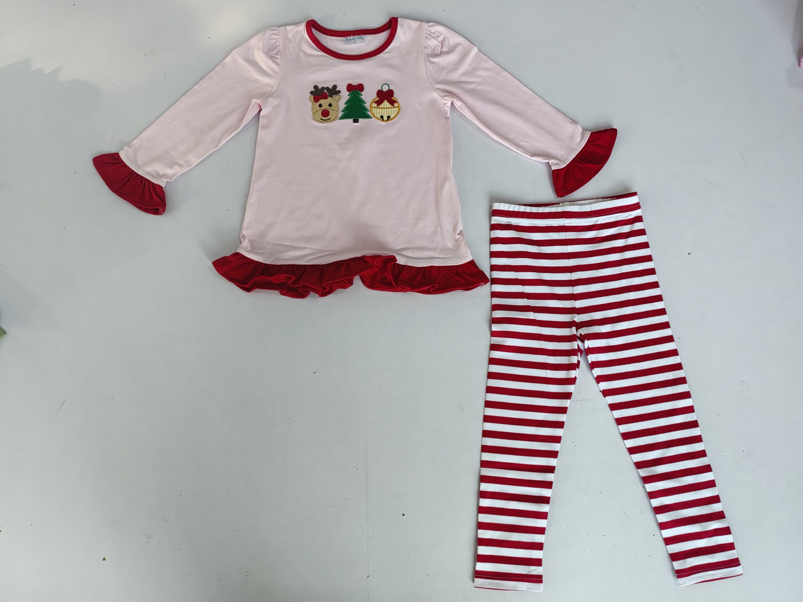 This festive two-piece set features a soft pink long-sleeve top with red ruffle cuffs and hem, adorned with adorable Christmas embroidery (reindeer, tree, and ornament). It comes with matching red-and-white striped leggings, making it perfect for holiday photos, family gatherings, and cozy winter days. Made from soft, breathable cotton fabric, it’s gentle on little girls’ skin, stretchy, and comfortable for all-day wear.