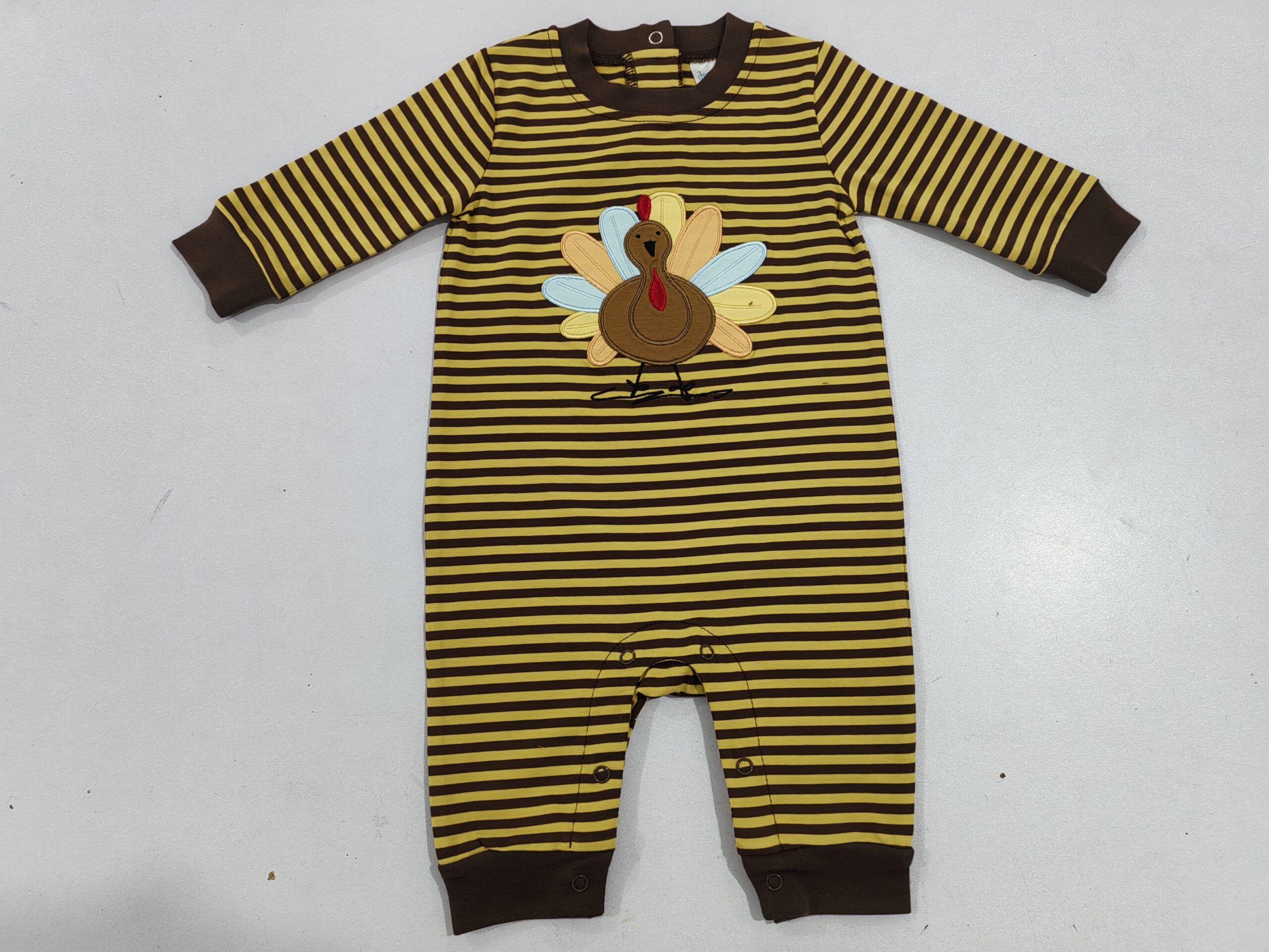 This cozy romper features brown and yellow stripes with a colorful turkey applique on the chest. It has solid brown ribbed trim on the crew neck and cuffs, plus snap closures at the crotch. Perfect for fall and Thanksgiving celebrations.