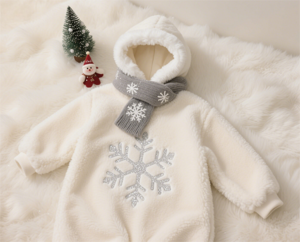 This infant onesie draws inspiration from winter snow scenes, featuring an off-white base paired with silver-gray snowflake prints; the fuzzy hood lining and scarf detail balance warmth and atmosphere. Made of fleece fabric, it’s soft and skin-friendly; the zipper closure allows easy dressing. With a gentle, healing style, it’s suitable for winter daily wear—it’s a cozy choice for babies to create a sweet winter-themed look.